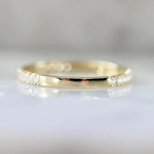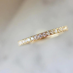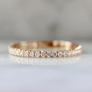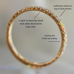 This scrumptious hand cut French pavé band features high quality, round brilliant cut white diamonds set 3/4 around, with a gold bar at the back for easy sizing. What makes Bisous special are the delicate v-shaped grooves that are hand carved to expose more of each diamond, creating a "floating" effect for maximum shimmer. Served in your choice of gold.