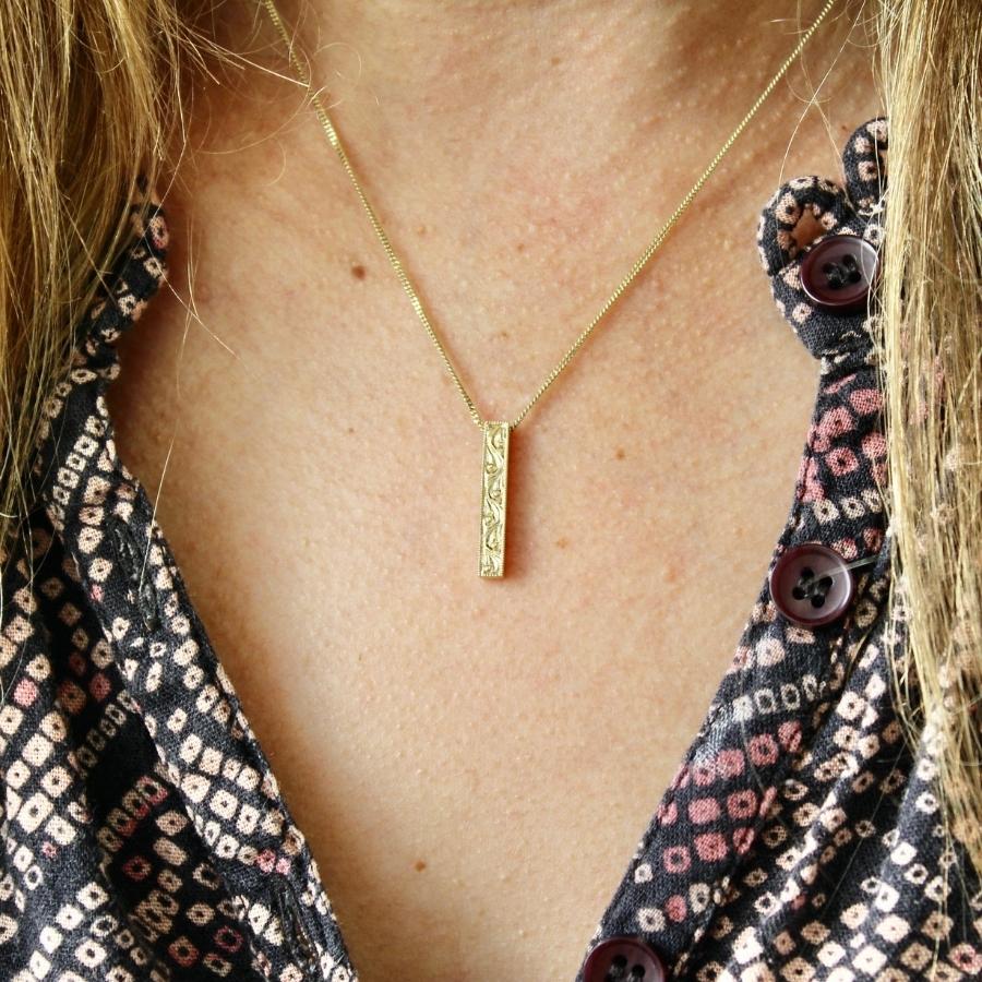 Look no farther for an ultra sleek, modern piece! This vertical bar necklace hands from a perfectly luxe 16 inch curb chain and feature both hand engraved scroll detail and milgrain on the borders. This is the perfect summer treat! All in 14k Yellow Gold.