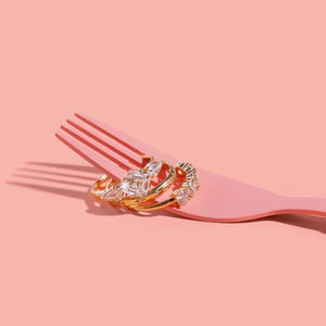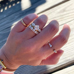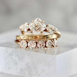 Each stone is prong-set for maximum sparkle (and minimum fuss), set low and close for comfort, with just the right amount of gold peeking through. Whether you wear it as a wedding band, anniversary ring, or just because you’re in a lifelong love affair with diamonds, this one is for the maximalists. Crafted in your choice of golds.