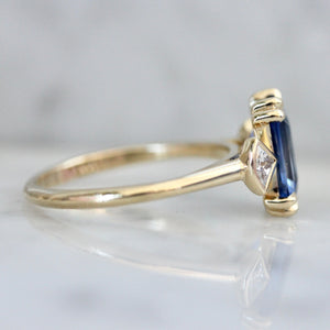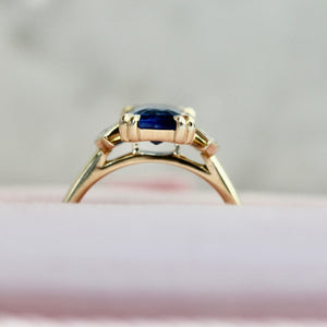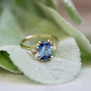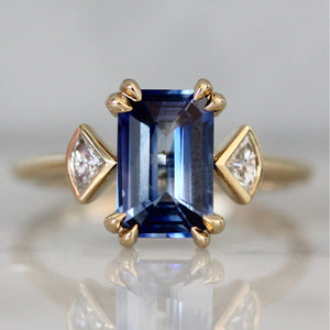 We are big fans of this ring! A bright cobalt blue 2.26 carat elongated emerald cut sapphire stuns in the center with eye-catching zoning and deeper hues in some areas that really make it pop. On either side are bezel set reclaimed white fan cut diamonds that bring a unique twist to a three stone ring making it truly one of a kind. The sapphire is secured with fun double claw prongs and is finished in a 14k yellow gold stackable setting to be paired with your favorite band.