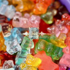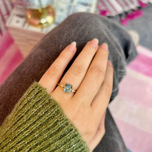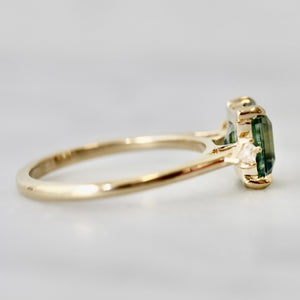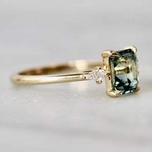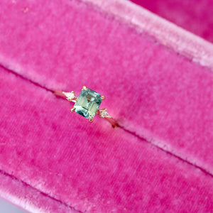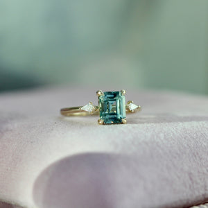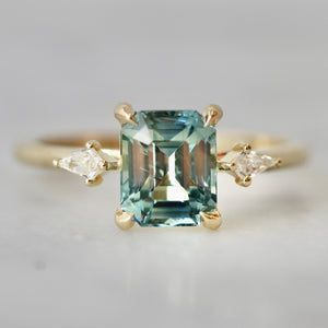 This ring is so divine, it just makes us want to dive head first into the depths of this bright and ethereal minty hued light teal emerald cut sapphire! She pairs exceptionally well with our favorite high quality and glowing kite cut side diamonds. This stackable ring is finished with petite claw prongs and 14k yellow gold.