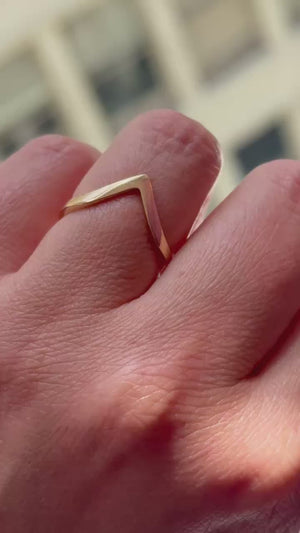 Sleek, minimal, and endlessly stackable - meet the chevron band. Crafted in warm, polished 14k yellow gold, this V-shaped band brings a modern edge to your ring stack. The soft curve tapers to a subtle point, perfect for nestling with your favorite solitaire or standing strong on its own. Whether you're layering or wearing solo, she is your golden go-to.