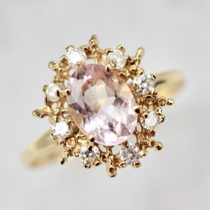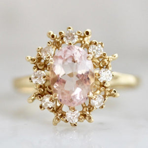 An exclusive design just for Gem Breakfast, featuring a stunning blush tone oval cut morganite that delivers compassion and healing vibes. Encircled in high-quality white diamonds and Ruta Reifen's signature textured gold flair. This ring has a magnificent presence for its price. This ring is stackable for a slim band.