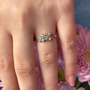 This rings features a trio of kite and bezel set princess cut sapphires that are the most deep and delicious shade of blue-green! The added four round brilliant cut Canadian diamonds are compass set and add the perfect amount of sparkle to complete this one of a kind ring. Finished in Recycled 14k Yellow Gold. This ring sits low profile and flush to the finger.