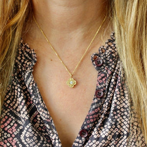 This necklace is perfect for those who like a bit of curve to their jewelry! Beautiful pairs of milgrain petals surround a .24 carat white round brilliant cut diamond, and hands from a 16 inch. wheat chain. All in 14k Yellow Gold.