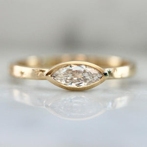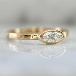 Glow Getter features a mesmerizing white moval cut diamond weighing in at .31 carats. This moval diamond is encapsulated in a full slim bezel and a flat band with our fan favorite orion star engraving detail.Set in 18k Peach Gold, this low profile moval  ring is ready to serve as the the ultimate self care treat. Limited Edition, there is only one as a part of the Alchemy Collection. Comes with a Bespoke For Gem Breakfast Kitty Baxter Ring Box.
