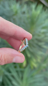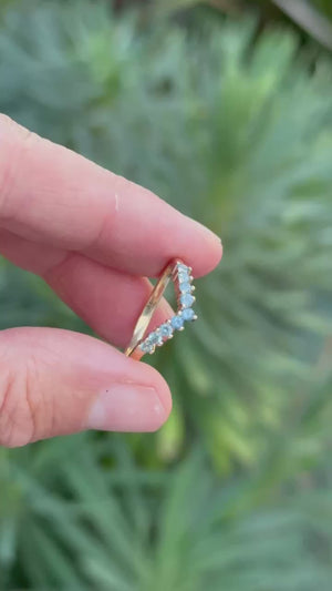 This curved Montana sapphire band boasts 9 of the most beautiful round cut blue-teal hued Montana sapphires sourced straight from the mystic skies. Set in delicious 14k yellow gold, this is one treat you don't want to miss out on. She pairs perfectly with low profile rings, but also stuns with stackable styles! Limited Edition, there is only one.