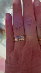 This ring features a yummy 1.55 carat oval cut sapphire with ethereal purple and pink hues and set east-west for maximum finger coverage. On either side sit a cluster of three light blue round brilliant cut Montana sapphires that complement the center so well. Claw prongs and 14k yellow gold finish this stackable ring.