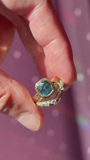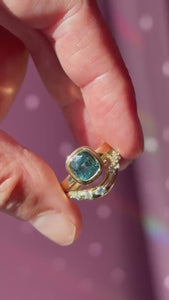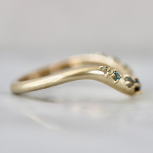 An understated curve with serious gravitational pull. Orbit wraps your finger in a soft arc of 14k yellow gold, scattered with a mixed of blue toned round cut sapphires - like tiny satellites caught mid-spin. Each stone is placed with just enough asymmetry to feel effortless, and plays well with others but stands strong on its own. Whether you're stacking or solo styling, Orbit will always finds its center. Limited Edition, there is only one.