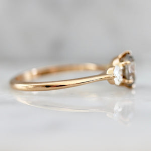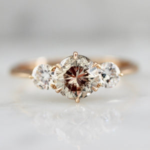 A lovely take on a classic three stone design, this unique round brilliant cut champagne salt & pepper diamond sits at the focus and is offset by a high quality white round brilliant cut diamonds that are perfectly matched. Chic baby claw prongs and our exclusive 18k Peach gold finish out this stackable engagement ring.