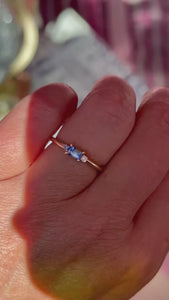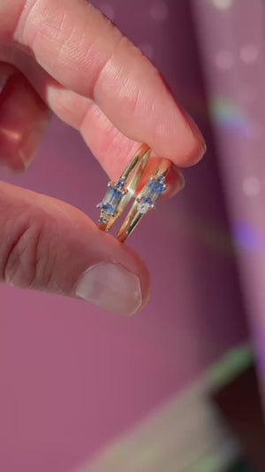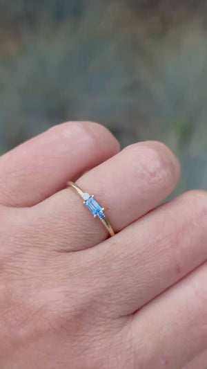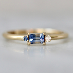 This low profile beauty features a mesmerizing .34 carat bi-color sapphire with cornflower blue coloring on the ends and a distinct stripe of white down the middle. The baguette cut facets are sharp and sleek and pair beautifully with a round cut diamond dewdrop on one side, and another dose of blue sapphire on the other. Crafted in 14k yellow gold and sits flush and comfortably to the finger. She's the perfect pop of color to treat yourself with!