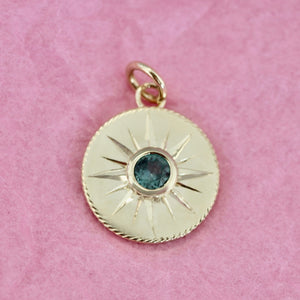 This pendant is the dreamiest little talisman, featuring a glowing .76 carat teal Montana sapphire in a lush bezel setting, framed by hand-engraved compass details and finished with a sweet rope border for extra vintage-inspired magic. All crafted in rich 14k yellow gold and ready to help you navigate any outfit crisis (or life decision).