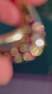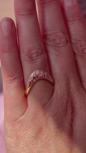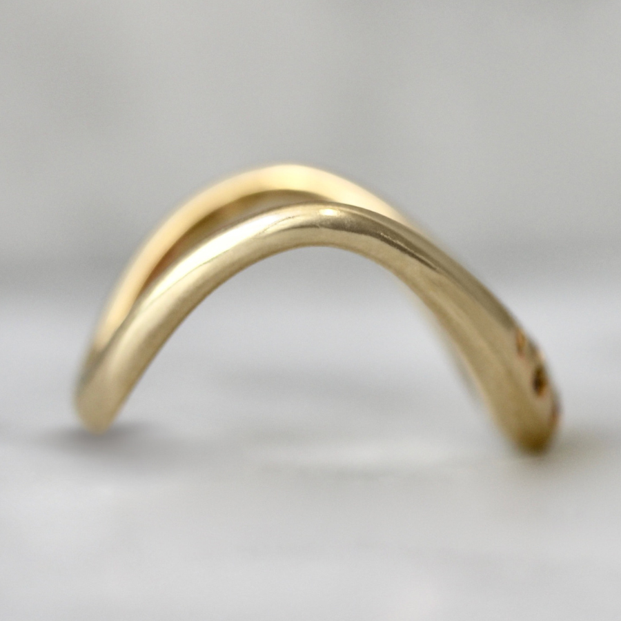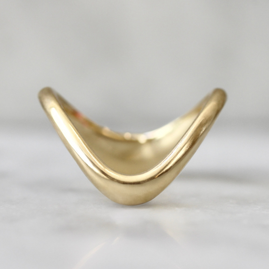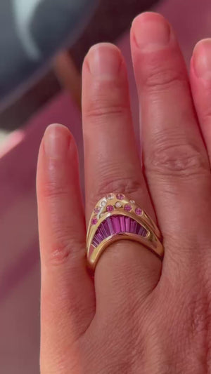 Zaha is queen of the curve! This ultimate statement ring is perfect on any finger and features a sprinkling of ombré pink round cut sapphires mixed with a smattering of white round cut diamonds. The gemstone really pop against the 14k yellow gold setting that lovingly tapers for the ultimate comfort fit and visual appeal.